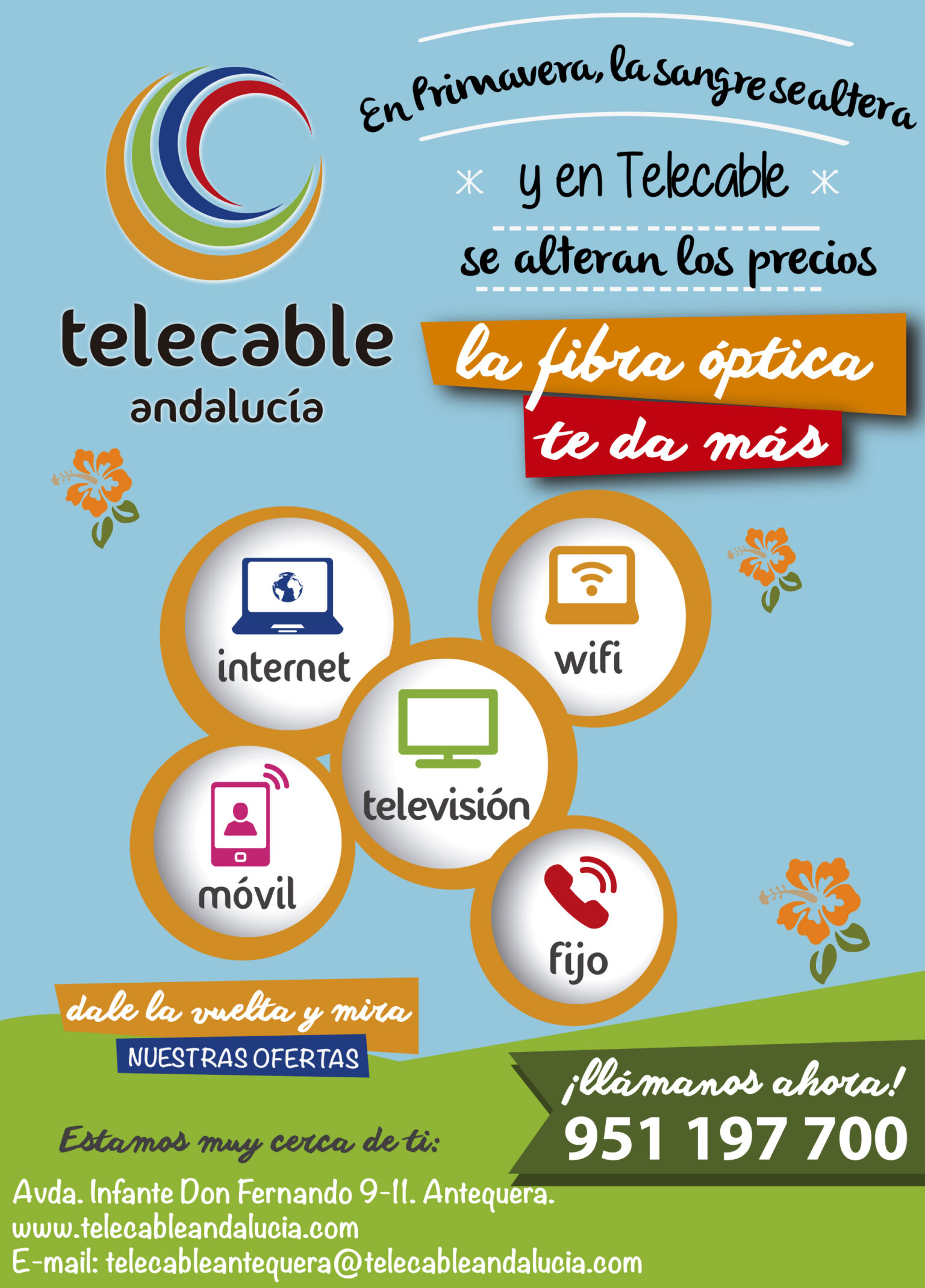 Llega la primavera. Nuevas ilusiones. Nuevos proyectos. Tiempo de cambios en la Naturaleza y también en las personas. Ya se sabe: “La primavera, la sangre altera”. En Telecable Ahora lo estamos notamos. Será el tiempo… será el clima… Será lo que será, pero nuestros precios también están cambiando, y ahora puedes disfrutar por sólo 17,90 euros -IVA incluido- de una conexión a Internet de 70 megas con fibra óptica, para los tres primeros meses del contrato, después por 20,90 euros.