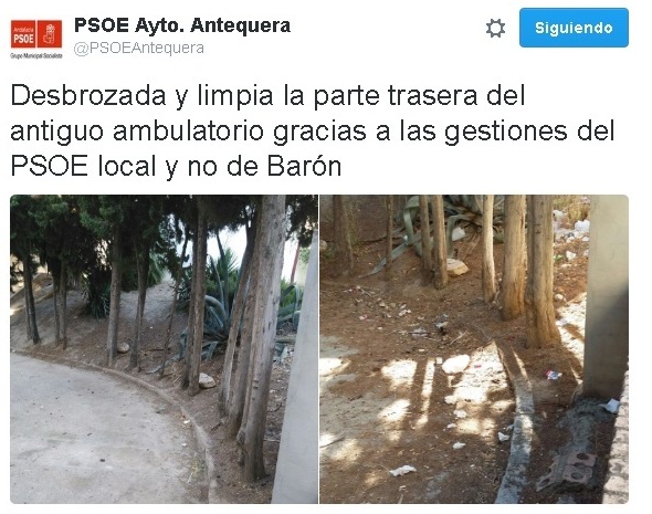 La limpieza en determinados puntos de Antequera continúa siendo objeto de polémica entre el Partido Popular y el PSOE. Así, si ayer el alcalde Manolo Barón, respondía a la críticas vertidas por los socialistas, sobre el estado de la ciudad o de zonas como el Polígono Industrial, este martes los populares lo han hecho tras una publicación en redes sociales del Grupo Municipal Socialista sobre el antiguo centro de salud.