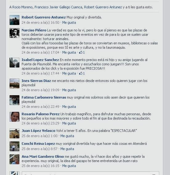 Isabel López Sanchez: En este momento preciso está mi hijo y su amigo jugando al fuerte de Playmobil. Me encanta verlos y escucharlos como juegan¡¡¡ Son unos apasionados de los click y la exposisción fue PRECIOSA¡¡¡
