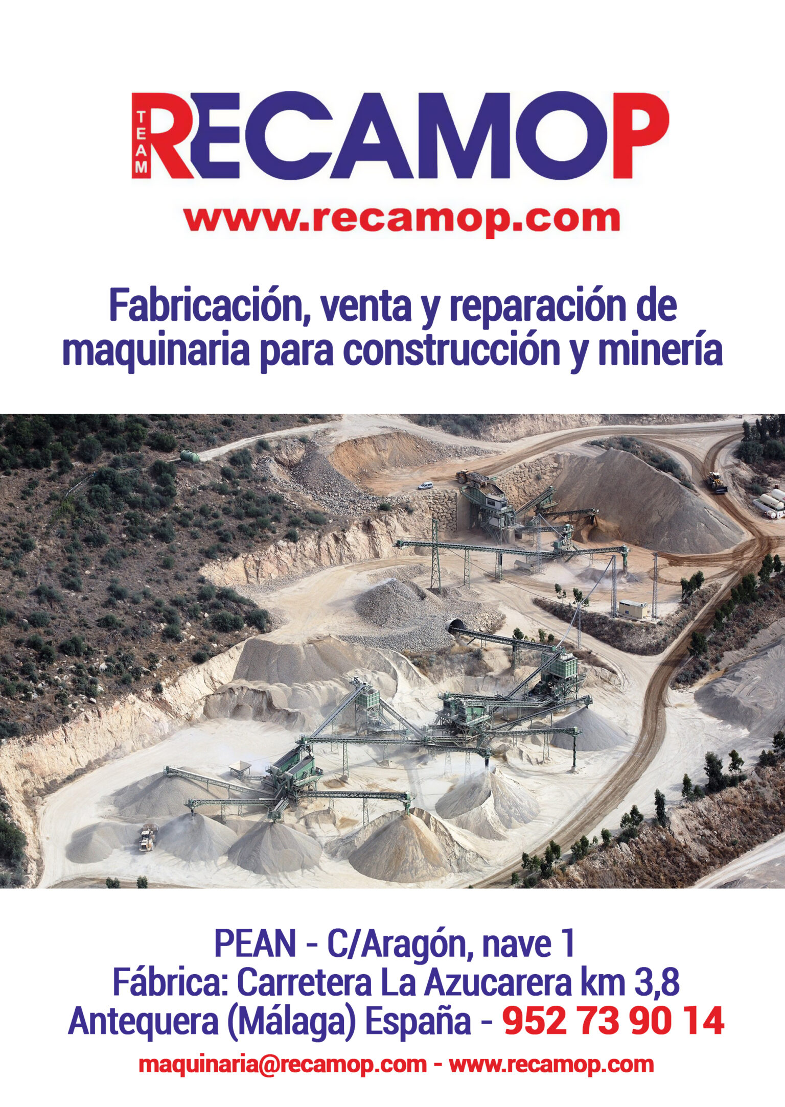 Para contactar con ellos pueden hacerlo en el polígono, Calle Aragón, nave 1. También pueden hacerlo en su fábrica situada en la Carretera La Azucarera a la altura del kilómetro 3,8. Si lo desean pueden contactar con ellos a través de su teléfono 952739014 o por correo electrónico, maquinaria@recamop.com. Podrán comprobar todo lo escrito anteriormente y la maquinaria de la que disponen en su web www.recamop.com. Estamos seguro de que no se arrepentirán.