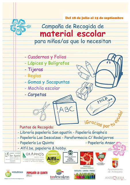 La Plataforma para la Promoción del Voluntariado de la Comarca de Antequera recuerda el transcurso de la Campaña de Recogida de Material Escolar para niños y niñas que lo necesitan la cual está funcionando hasta el próximo 15 de Septiembre.