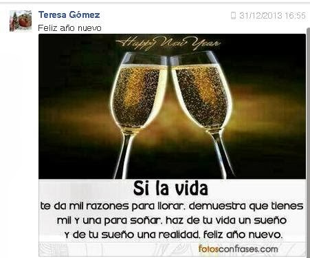 Teresa Gómez: Feliz Año nuevo, si a la vida. Te da mil razones para llorar. Demuestra que tienes mil y una para soñar. Haz de tu vida un sueño, y de tu sueño una realidad.