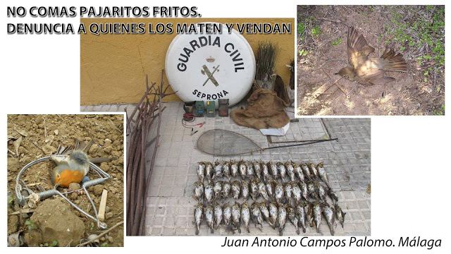 – No compreis ni comais pajaritos fritos. Denuncia a los que los matan y venden. Todas las aves insectívoras están protegidas por la Ley y son muy beneficiosas para la agricultura y la Naturaleza ya que consumen gran cantidad de insectos.