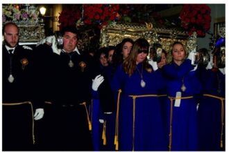 5.- Calle Méndez Núñez. Fachada engalanada por la Archicofradía de la Pasión y petalada del grupo de hombres de trono de la Virgen de la Soledad de Mena ‘La Galera’.