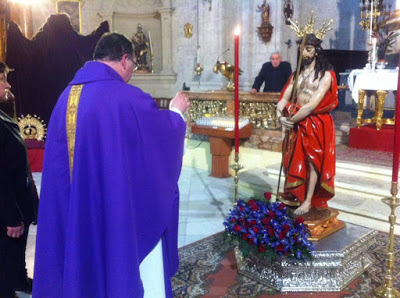 El Rdo. padre D. Juan Carlos Hidalgo Zúñiga, consiliario de la hermandad fue el encargado de bendecir lo presentado por parte de la hermandad. Otro acto esperado fue cuando la Real Cofradía de la Santa Vera Cruz Jesús Preso y Ntra. Sra. de los Dolores cedieron la corona dorada de su Virgen para que este próximo domingo de Ramos lo pueda lucir la Santísima Virgen de la Luz, con motivo del décimo aniversario de esta titular Mariana. La Santa misa estuvo acompañada musicalmente por un trío de música de cámara.