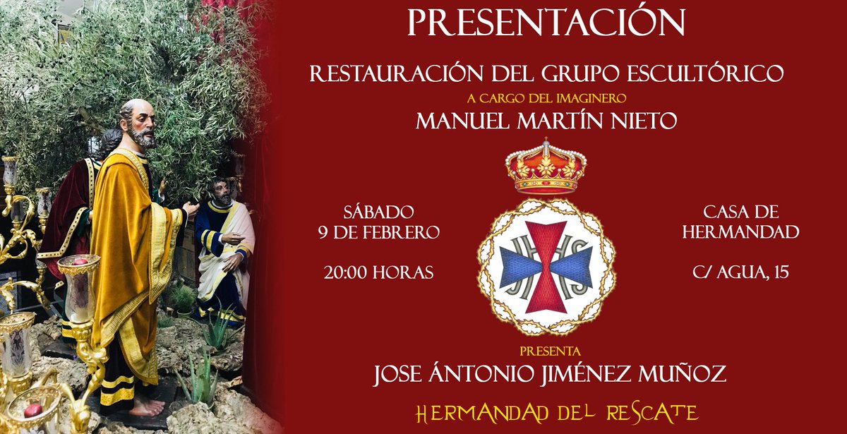 La Hermandad de Nuestro Padre Jesús del Rescate de Málaga, informa que tras un magnífico trabajo realizado por el imaginero y restaurador Manuel Martín Nieto, se presentará este próximo sábado 9 de febrero la restauración del grupo escultórico que acompaña a Nuestro Padre Jesús del Rescate cada Martes Santo.