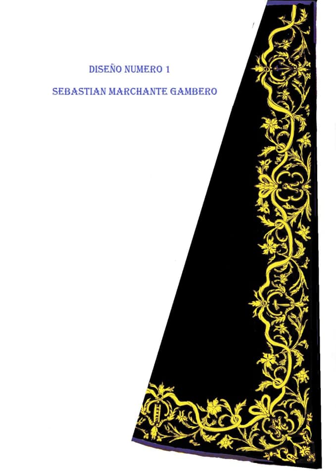 El manto será ejecutado en terciopelo negro bordado en oro fino, y en el mismo se representarán, entre otros exhornos, los elementos de la pasión de Jesucristo, siguiendo la temática contenida en el primitivo palio de Nuestra Señora de la Soledad, que la Cofradía conserva cuidadosamente enmarcado en la casa de hermandad y que data del primer cuarto del S. XVIII. Pieza que ha servido de inspiración al artista malagueño para la concepción del encargo, por ser acorde al estilo de bordado que caracteriza a esta cofradía del Viernes Santo de Antequera.