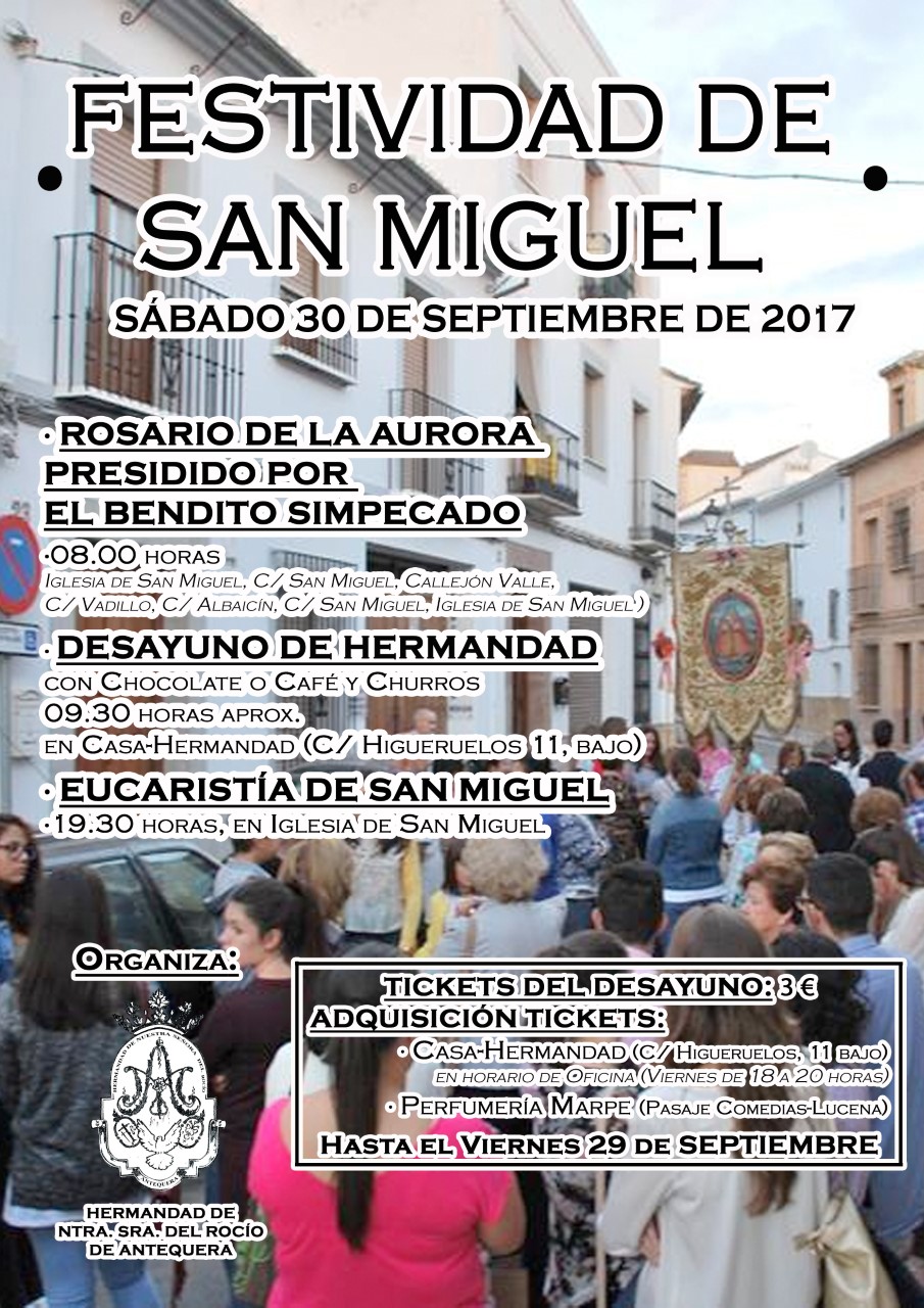 El próximo sábado 30 de Septiembre tendrá lugar el tradicional Rosario de la Aurora por las calles del barrio de San Miguel, presidido por su bendito Simpecado, con motivo de la Festividad de San Miguel tal y como recogen los estatutos de la Hermandad del Rocío de Antequera.