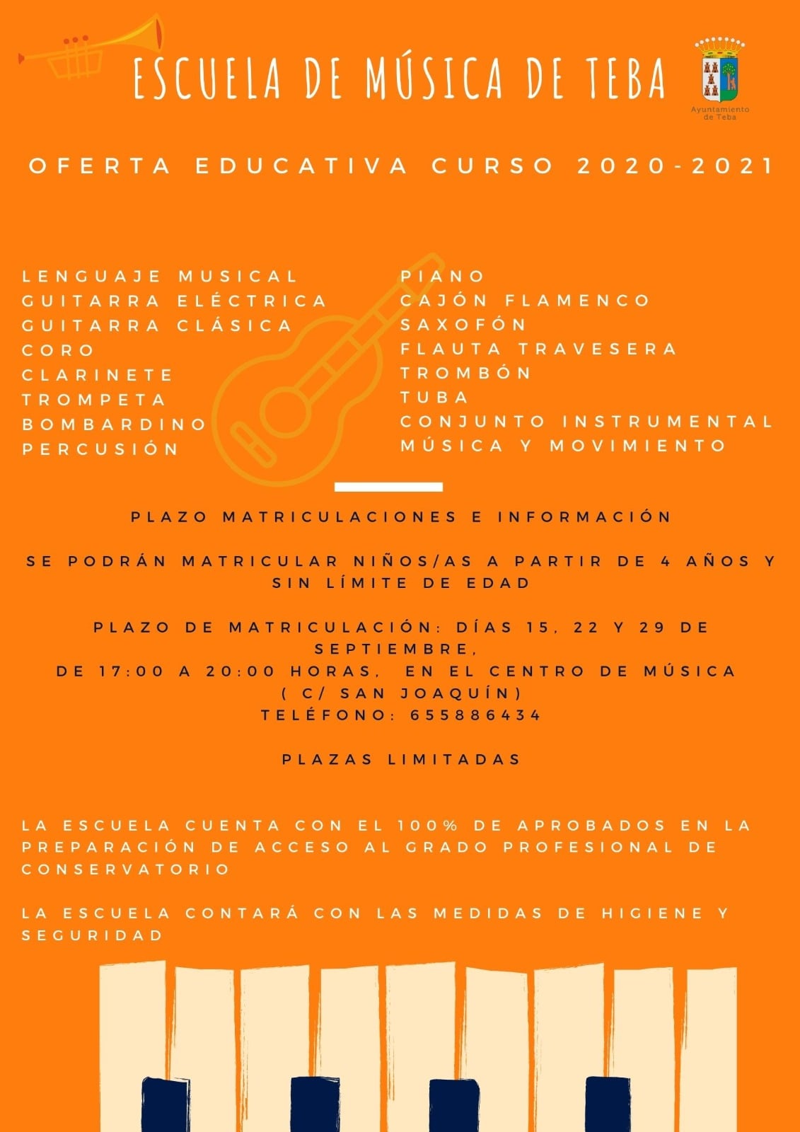 El Ayuntamiento de Teba informa que a partir del martes 15 de septiembre se abrirá el plazo de información y matriculación para formar parte de la Escuela de Música Municipal en su nuevo curso educativo 2020/2021.