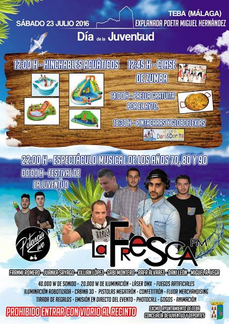 Los jóvenes de Teba se darán cita este sábado en una gran fiesta que se ha organizado por parte de la Concejalía de Juventud y Deportes y que contará con el siguiente programa de actividades en la Explanada Poeta Miguel Hernández de la localidad.