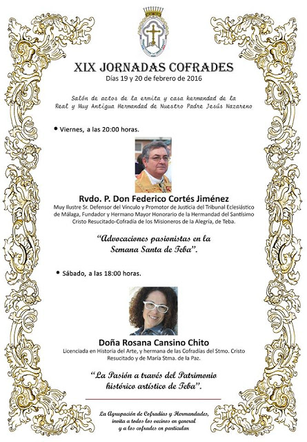 Se organiza por la Agrupación de Cofradías las décimo novenas Jornadas Cofrades que tendrá lugar el Viernes 19 y Sábado 20 de Febrero en el