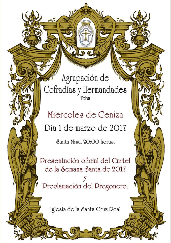 La Agrupación de Cofradías y Hermandades de Teba presentará su Cartel de la Semana Santa de 2017 el próximo miércoles de ceniza, día 1 de Marzo.