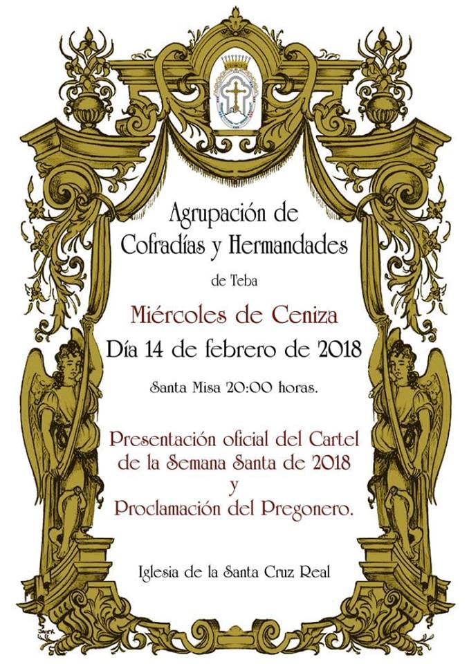 La Agrupación de Cofradías y Hermandades de Teba organiza celebración del Miércoles de Ceniza el próximo miércoles 14 de febrero a las 20.00 horas.