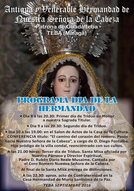 Sábado 10 de Septiembre, a las 19.00 horas, en el salón de actos de la casa de la cultura tendrá lugar la conferencia titulada “El camino del corazón del romero. Pasos hacia Nuestra Señora de la Cabeza” que será realizada por Diego Fontalba, hijo pródigo de la villa condal reencontrado con sus cultos. Posteriormente, a las 21.00 horas tendrá lugar la celebración religiosa del tecer día del triduo que será oficiada por el párroco y director espiritual Rubén Darío Reale Musaime y cantada por el Coro Romero de Nuestra Señora de la Cabeza. Tras la Santa Misa se harán entrega de las distinciones. A las 22.30 horas aproximadamente tendrá lugar el acto de confraternidad en la Casa Hermandad de María Santísima de la Paz.