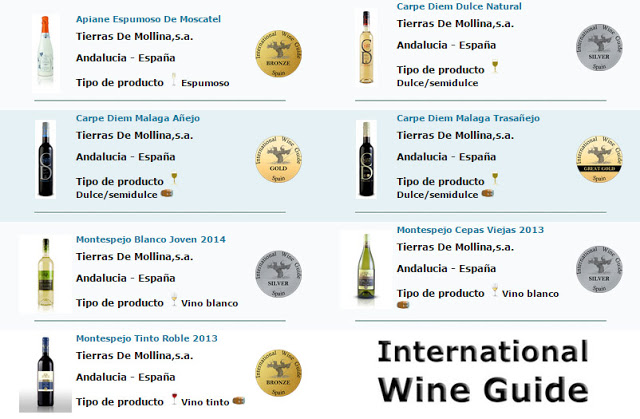 La bodega Tierras de Mollina, integrada en el grupo Dcoop, ha sido galardonada con siete nuevas medallas en el concurso International Wine Guide 2015, que está organizado y desarrollado por Catavinum en Vitoria-Gasteiz (España). Así lo han comunicado los organizadores del certamen a la bodega este mismo lunes.