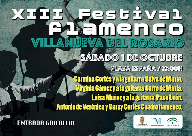 El sábado 1 de octubre regresa el Festival Flamenco de Villanueva del Rosario que este año celebra su décimo tercera edición. Será en la plaza España, a partir de las diez de la noche, con entrada gratuita. Actuarán Carmina Cortés y Salva de María a la guitarra; Virginia Gámez acompañada a la guitarra por Curro de María; Luisa Muñoz y a la guitarra Paco Léon; Antonio de Verónica y Saray Cortés cuadro flamenco.