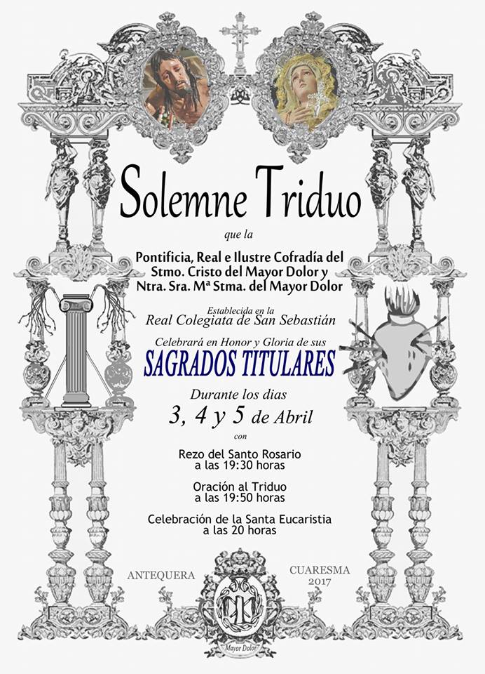 La Pontificia, Real e Ilustre Cofradía del Cristo del Mayor Dolor y Nuestra Señora del Mayor Dolor de Antequera celebrará solemne triduo en honor y gloria de sus Sagrados Titulares durante el lunes 3, martes 4 y miércoles 5 de abril.