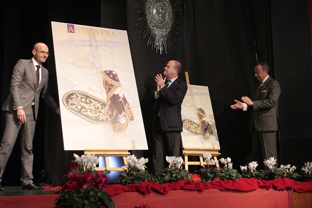 En la noche del viernes el Teatro Torcal de Antequera volvió a ser testigo de la presentación del cartel de Semana Santa. Eran cerca de las diez de la noche cuando el autor, Antonio Castillo, el presentador, Juan Manuel González, y el alcalde de la ciudad, Manolo Barón, descubrieron la imagen.