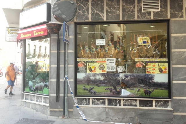 El comercio, ubicado entre la calle Lucena e Infante Don Fernando, frente a la Iglesia de San Agustín, ha amanecido con uno los cristales rotos, y una pequeña abertura, precisamente en el escaparate donde se encontraba colgado varios jamones.