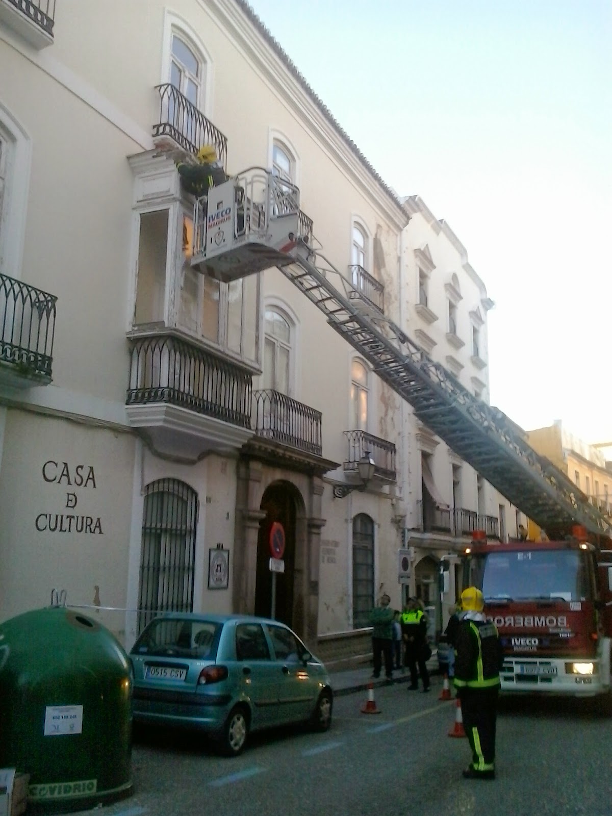 [VÍDEO] Desprendimiento parte de una cornisa en la Casa de la Cultura de calle Carreteros de Antequera