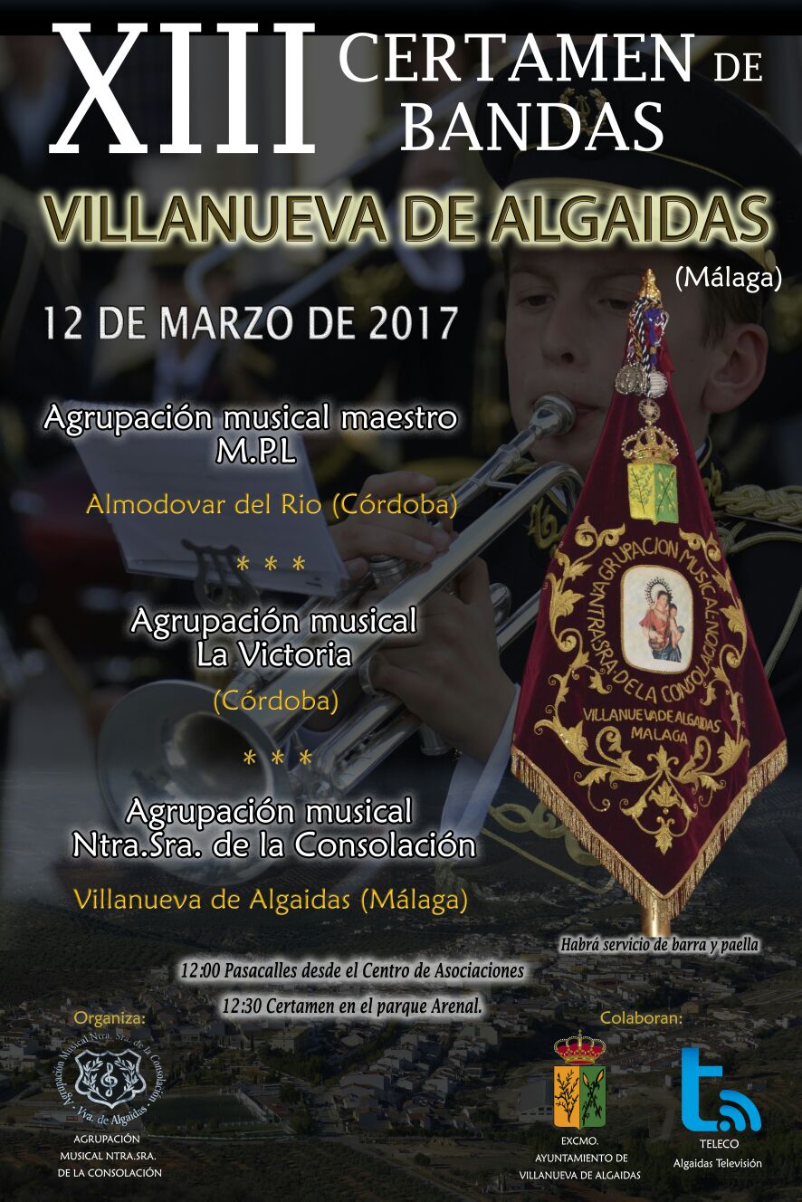 La Agrupación Musical Nuestra Señora de la Consolación de Villanueva de Algaidas organiza el decimo tercer Certamen de Bandas que tendrá lugar el domingo 12 de marzo a las 12.30 en el Parque Arenal.