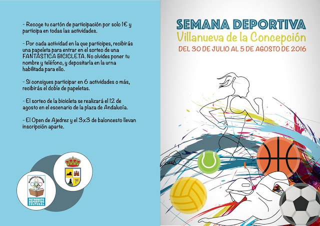 Villanueva de la Concepción celebra del 30 de julio al 5 de agosto su semana deportiva. Los que quieran participar podrán recoger su inscripción por un euro y realizar todas las actividades organizadas. Por cada una de ellas se entregará a la persona una papeleta para entrar en el sorteo de una bicicleta, cuyo resultado se conocerá el 12 de agosto en el escenario de la Plaza de Andalucía.