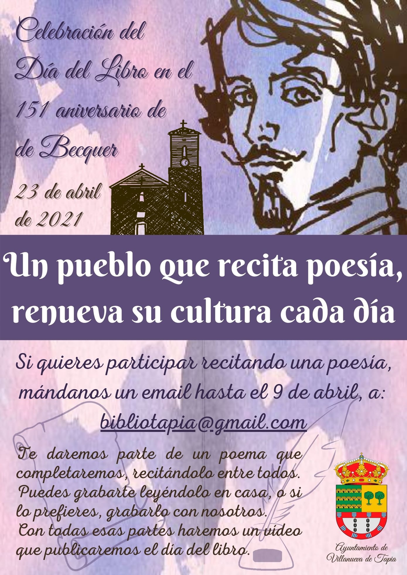 La Biblioteca Pública de Villanueva de Tapia, pone en marcha con motivo del próximo 23 de abril, día del libro, una actividad en la que los vecinos y vecinas podrán participar leyendo fragmentos de distintas obras de Gustavo Adolfo Becquer. La particularidad es que estas lecturas se grabarán en vídeo y posteriormente se realizará un montaje uniendo las distintas partes para crear un vídeo con los poemas completos, que será publicado el Día del Libro.
