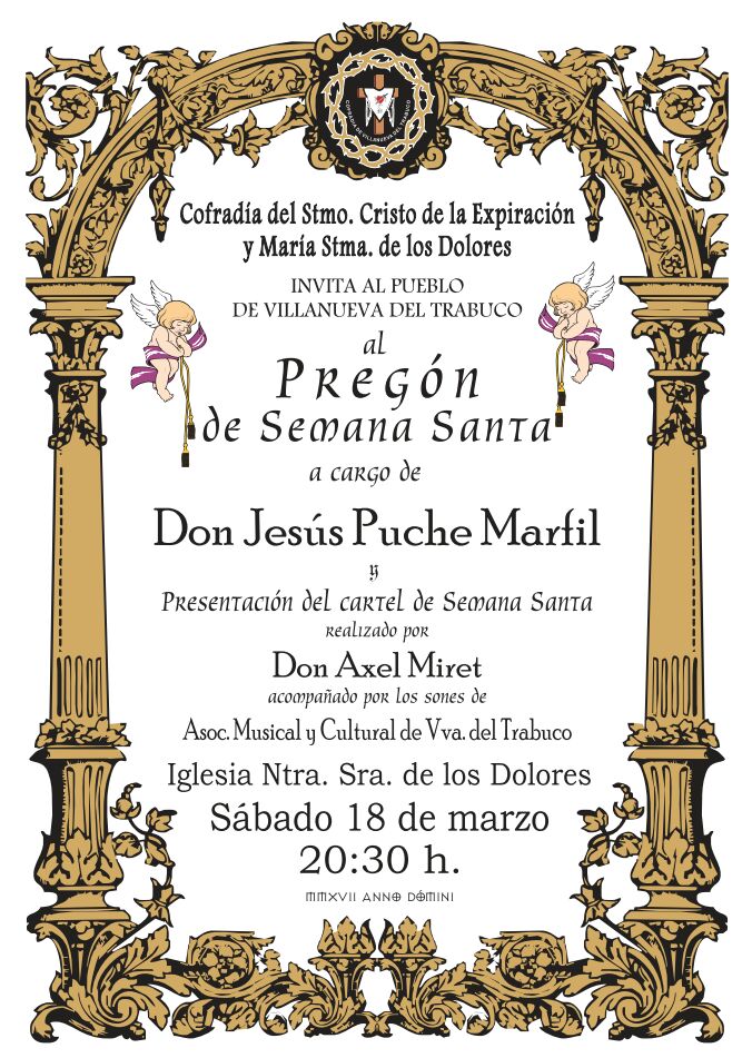 Este sábado 18 de marzo a las 20.30, tendrá lugar el pregón de Semana Santa y la presentación del cartel de Villanueva del Trabuco en la  iglesia parroquial de Nuestra Señora de los Dolores.