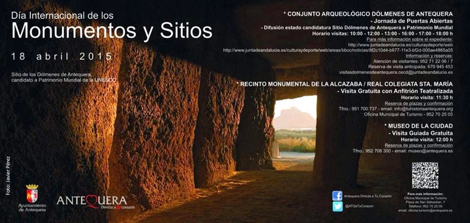 Este sábado 18 de Abril, Antequera también celebra el Dia Internacional de los Monumentos y los Sitios donde con dicho motivo especial se han organizado en el Conjunto Arqueologico de los Dolmenes de Antequera, el Recinto Monumental de la Acalzaba y la Real Colegiata y el Museo de la ciudad las siguientes actividades:
